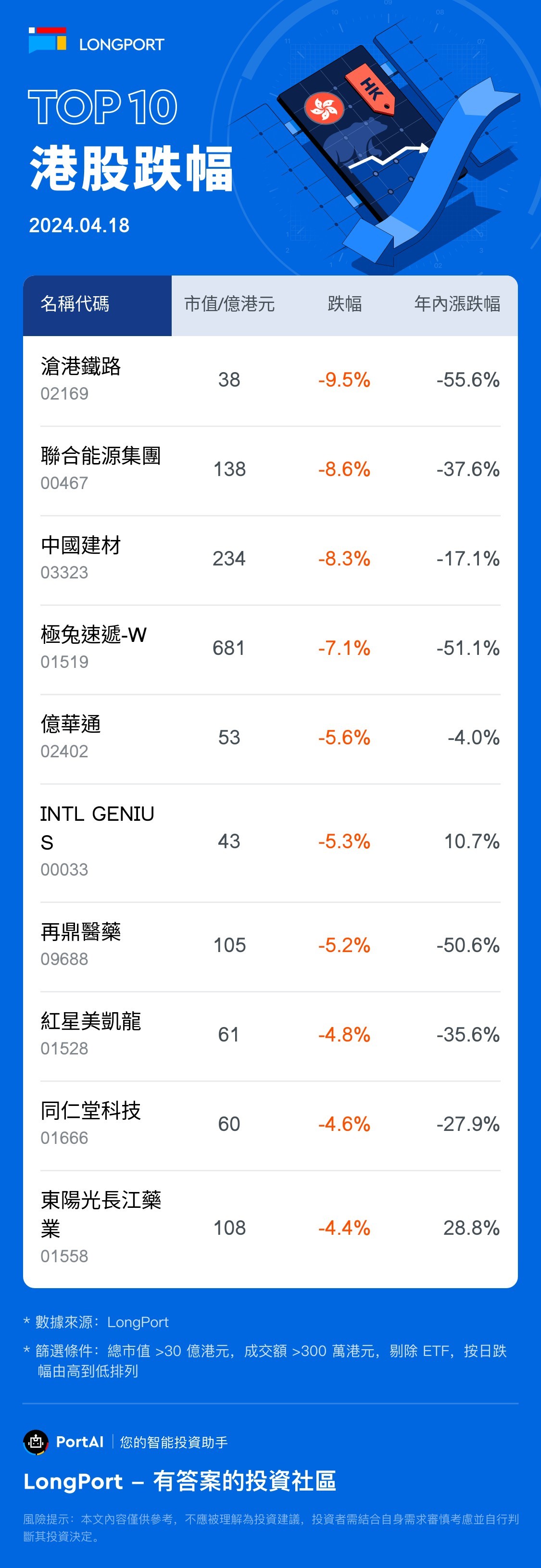 Top 10 HK Stock Losers (4.18)
