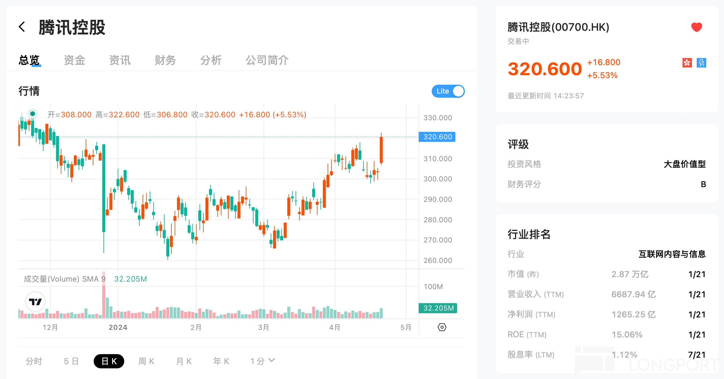 截止發稿,騰訊 (00700) 大漲 5.5%,報 320.6 港元,股價創 2023 年 12 月以來新高。