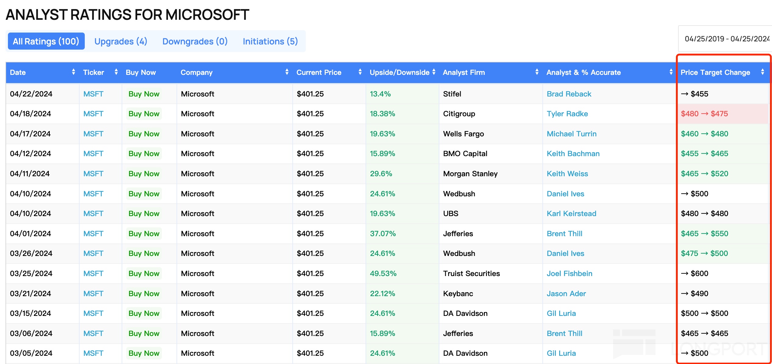 3 月份以来,大多机构看好微软,有五家上调目标价,有一家下调目标价。