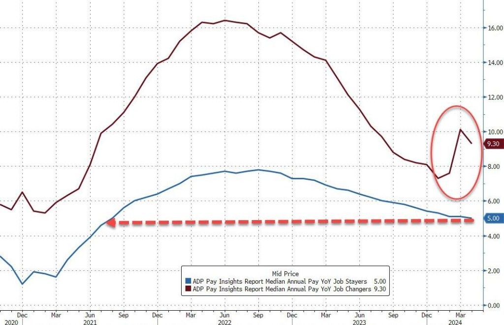ADP 的工資數據顯示,無論是跳槽者還是留在本公司的員工,他們的工資增長均在放緩,不過前者仍然處於較高水平。具體來説,4 月跳槽者工資同比增幅為 9.3%,較 3 月增幅收窄,但是仍明顯高於幾個月前的低谷;而留在本公司的員工工資較一年前增長了 5%,這是 2021 年以來的最低增幅。