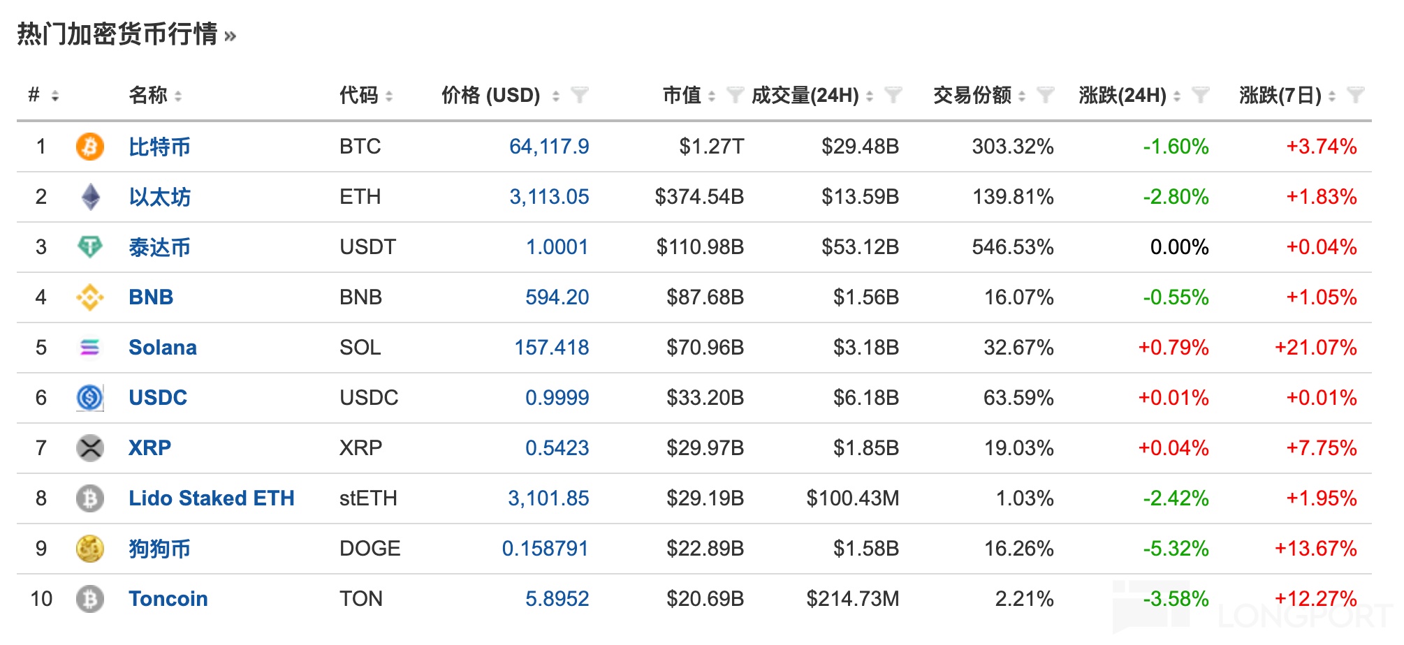 比特幣現報 64118 美元,24 小時跌近 2%;以太坊現報 3113 美元,24 小時跌近 3%。
