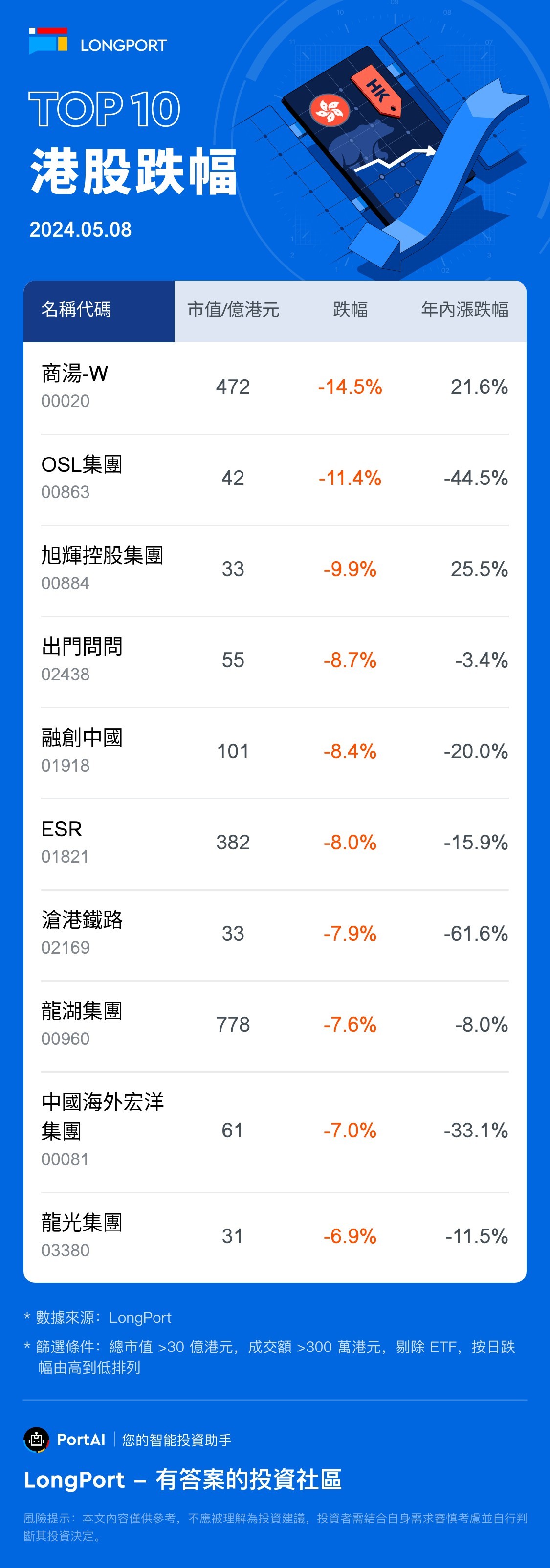 商湯-W(00020) 跌 14.55%,成交额 43.0 亿港元,年内累计涨 21.6%。 OSL 集團 (00863) 跌 11.42%,成交额 3832.9 万港元,年内累计跌 44.5%。 旭輝控股集團 (00884) 跌 9.86%,成交额 5703.0 万港元,年内累计涨 25.5%。
