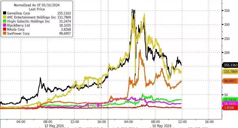 其中視頻遊戲零售商 GameStop(GME)和電影集團 AMC Entertainment(AMC)股價繼續飆漲。在週一分別斬獲 73% 和 77% 的驚人漲幅後,隔夜 GME 和 AMC 各自繼續暴漲 60% 和 32%,創下 2021 年 6 月和 2021 年 1 月以來最大漲幅。