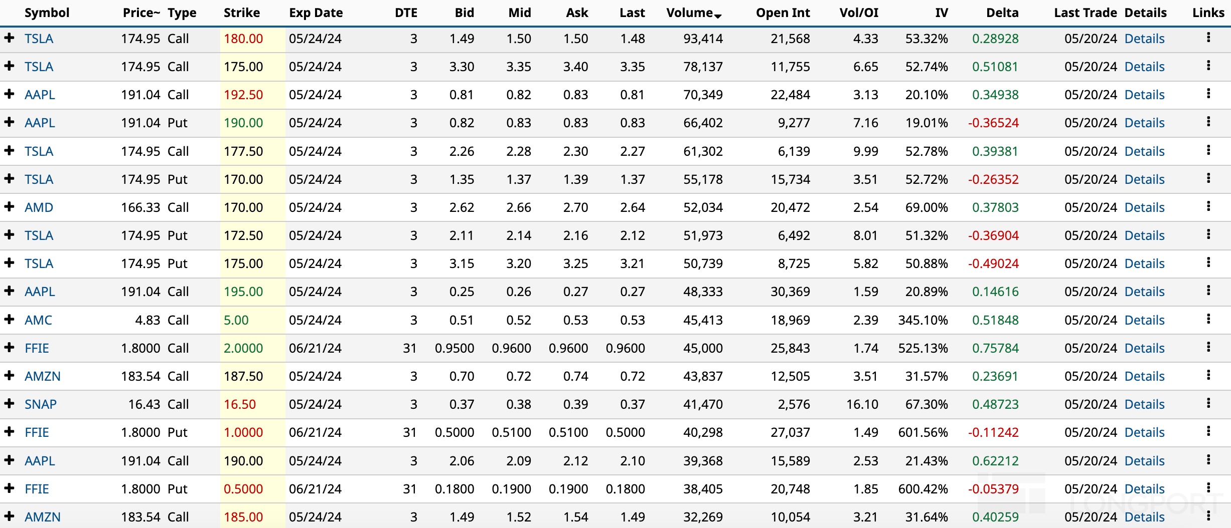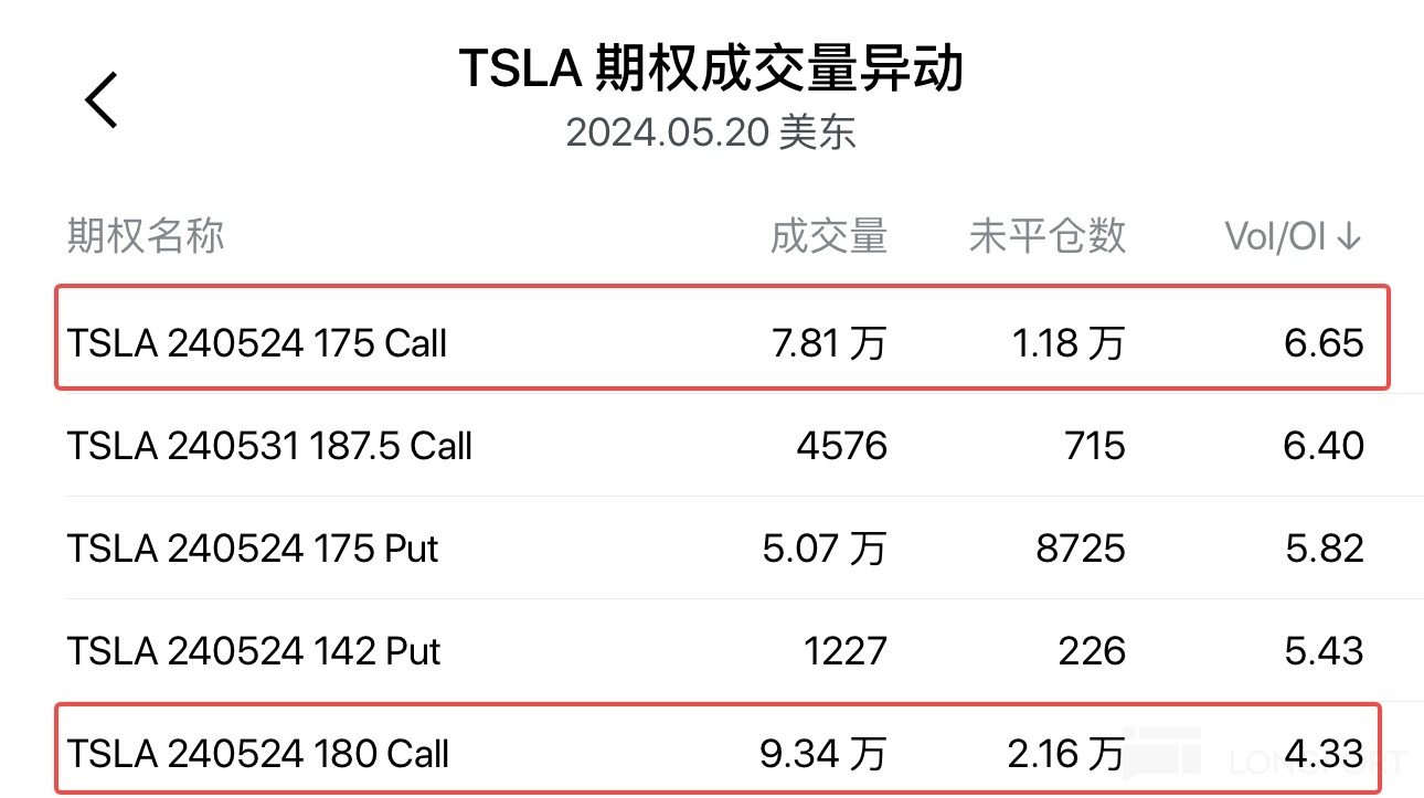 特斯拉跌超 1%,期權成交腰斬至 100 萬張,看漲期權佔比 57.4%。5 月 24 日到期、執行價 180 美元的看漲期權成交 9 萬張,執行價 175 美元的看漲期權成交近 8 萬張。