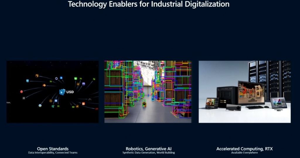 基於英偉達的 Omniverse(全宇宙)虛擬現實和仿真平台以及微軟 Azure 雲服務可以開發先進的數字孿生工具(digital twin),方便重工業的工程師和開發人員於精確模擬物理世界的 3D 虛擬環境中,在一間工廠正式動工奠基之前便完成設計、測試、驗證、優化生產線和自動化等多項流程。