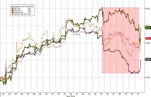 週五,標普 500 指數在尾盤反彈,收漲近 1%,受巨頭股拖累,該指數此前一度下跌近 1%。五月,標普累漲 4.8%,創下 2 月以來最佳月度表現。