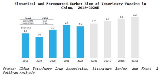 已有成熟產品和穩定客源,似乎並不意味着正業生物能夠躺在豬週期上 “安枕無憂”。在過去的 10 年裏,完善的產品線是動保企業快速成長的助推器。招股書顯示,2022 年中國獸用疫苗市場規模為 25 億美元,預計 2026 年將進一步增長到 32 億美元,複合年增長率將維持在 6.5%。