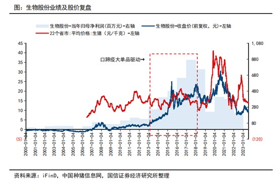 從動保行業屬性來看,市場普遍認為,若豬價景氣上行,頭部動保企業優質產品充分受益,因此動保板塊通常是伴隨着 “後豬週期” 啓動行情。同時,新的大單品出現,往往會成就 2-3 家或者板塊性的成長機會,業績快速爆發,可以做到短期逆豬價。例如,2013-2017 年的口蹄疫,成就了生物股份。
