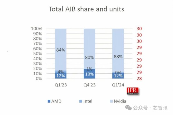 在業績與股價雙雙狂飆猛進的同時,英偉達的市場份額也持續上升。據市場研究機構 Jon Peddie Research 的最新報告顯示,2024 年一季度全球獨立顯卡 (AIB) 出貨量為 870 萬台,較上季度的 950 萬台下降了 7.9%,同比增長 39.2%。其中,英偉達的份額進一步提升到了 88%,AMD 的份額減少了 7 個百分點降至 12%,英特爾的份額不足 1%。