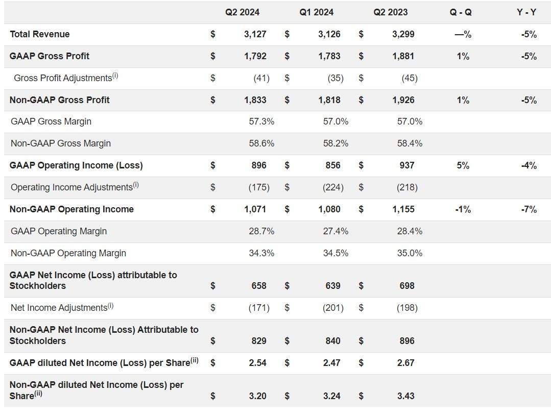 恩智浦公佈財報顯示,截至 6 月末的今年第二季度,公司營收 31.3 億美元,同比下降 5.2%,大致符合分析師預期,一季度同比略為增長近 0.2%;當季非 GAAP 口徑下稀釋後每股淨利潤為 3.20 美元,同比下降 6.7%,環比下降 1.2%,也符合預期。