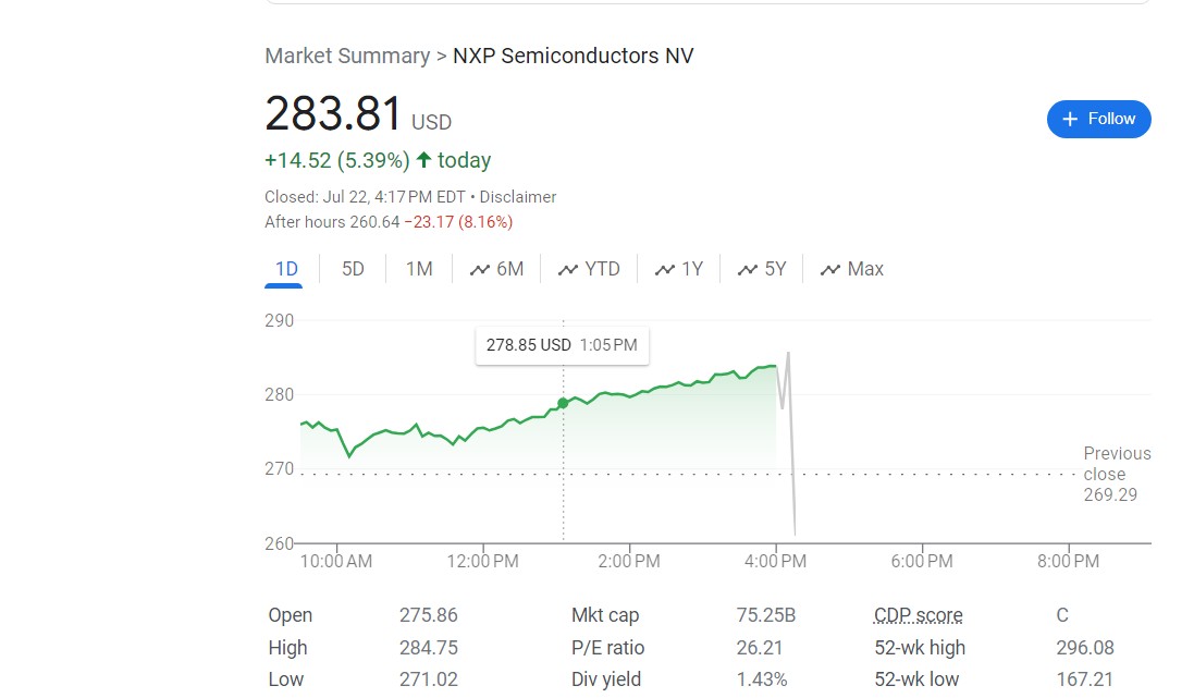 7 月 22 日週一美股盤後,在納斯達克上市的恩智浦美股在公司財報公佈後跳水。原本週一股價收漲約 5.4%,盤後一度跌超 8%。