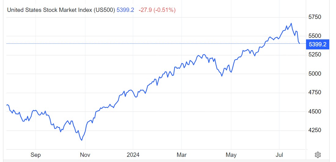 在週四,標普 500 與納指連續三日下跌,小盤股基準指數——羅素 2000 指數則自 7 月以來持續跑贏標普 500 指數,意味着在美聯儲降息預期主導下,市場資金持續輪動至股價長期遭重創的小盤股,小盤股往往更加受益於降息。“七大科技巨頭” 佔高權重的兩大基準指數近期大幅調整的背後,除了市場擔憂 AI 盈利前景以及估值處於歷史最高位的科技巨頭們業績可能達不到市場予以的超高業績預期,“懂王” 重返白宮可能帶來的加徵關税這一不利於股市的負面預期也是主導邏輯。