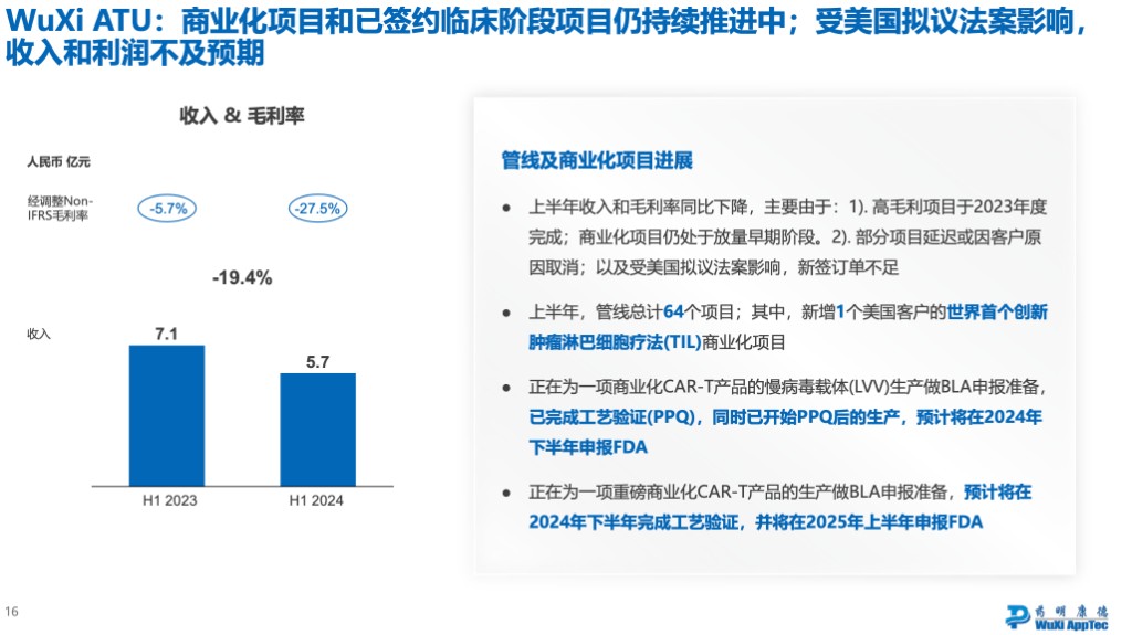 影響最嚴重的是 ATU 部門(主要涉及細胞與基因治療),也是公司演示材料中説明因為法案影響收入利潤不及預期的部分。由於其特殊的產品要求,客户擔憂程度最高,新增產品受限最大,目前公司將努力完成在手訂單。