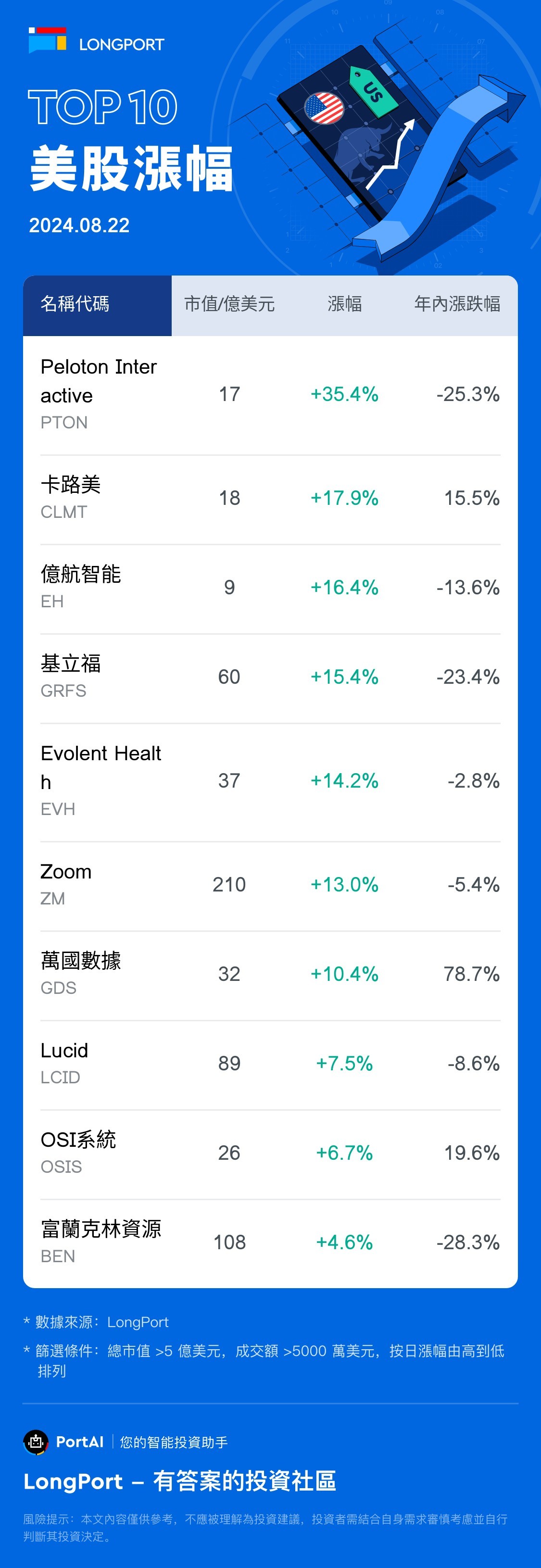 Peloton Interactive(PTON) 涨 35.42%,成交额 5.8 亿美元,年内累计跌 25.3%。 卡路美 (CLMT) 涨 17.88%,成交额 5208.6 万美元,年内累计涨 15.5%。 億航智能 (EH) 涨 16.44%,成交额 7482.0 万美元,年内累计跌 13.6%。