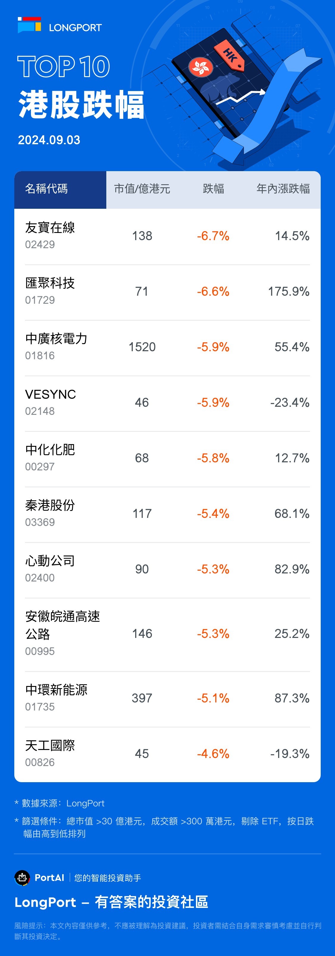 友寶在線 (02429) 跌 6.74%,成交额 4954.7 万港元,年内累计涨 14.5%。 匯聚科技 (01729) 跌 6.65%,成交额 2509.8 万港元,年内累计涨 175.9%。 中廣核電力 (01816) 跌 5.94%,成交额 6.8 亿港元,年内累计涨 55.4%。