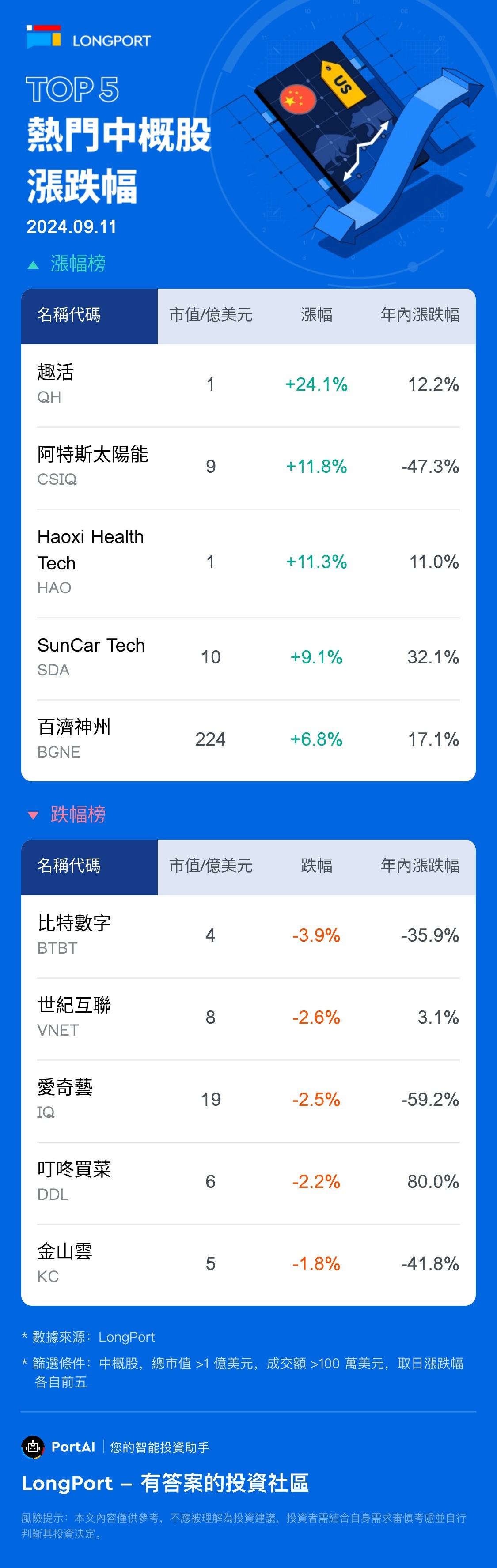 趣活 (QH) 涨 24.06%,成交额 2.2 亿美元,年内累计涨 12.2%。