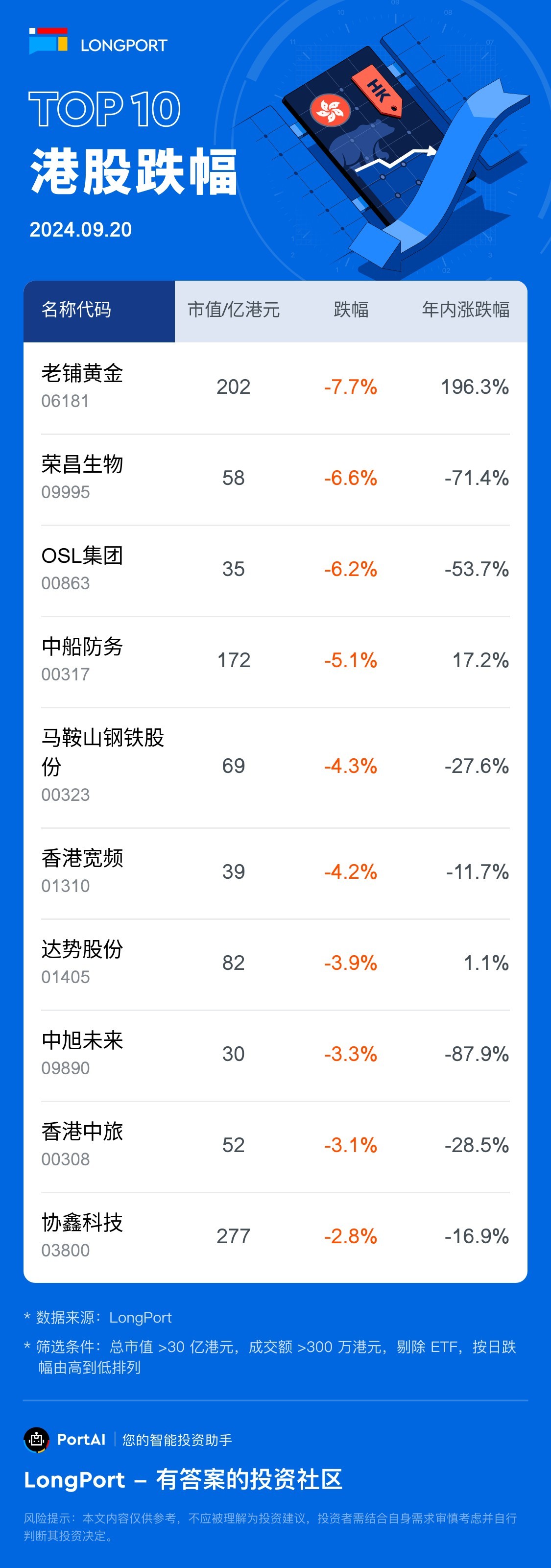 老铺黄金 (06181) 跌 7.69%,成交额 1.3 亿港元,年内累计涨 196.3%。 荣昌生物 (09995) 跌 6.62%,成交额 6076.8 万港元,年内累计跌 71.4%。 OSL 集团 (00863) 跌 6.17%,成交额 652.0 万港元,年内累计跌 53.7%。