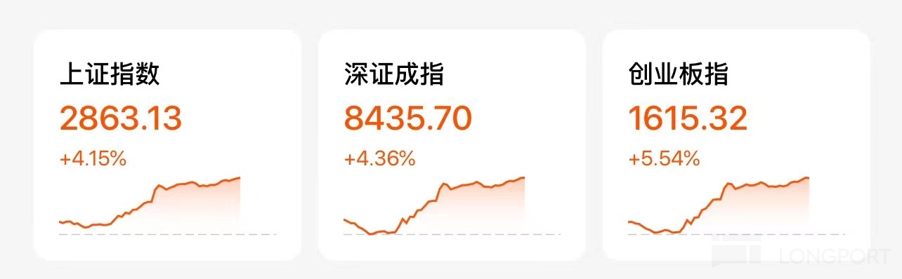 A 股、港股今日大涨,沪指和恒生指数均涨 4% 以上,富士中国 A50 指数大涨 5% 以上。