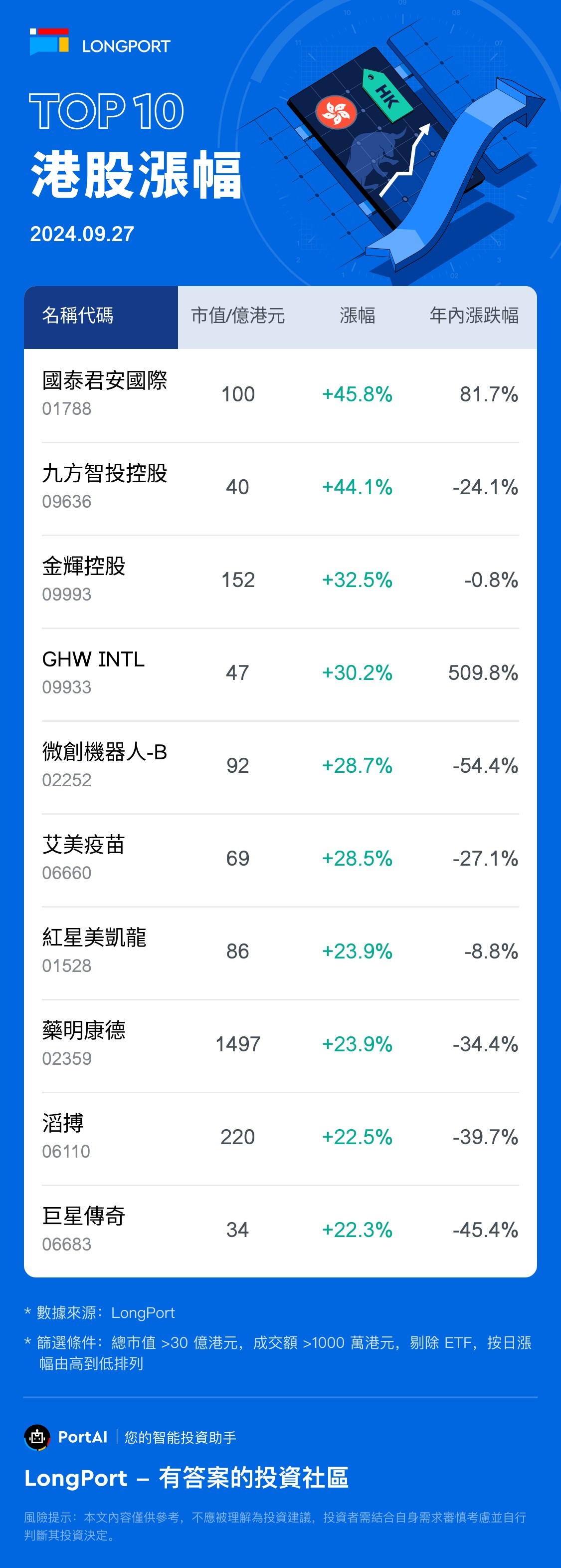 國泰君安國際 (01788) 涨 45.83%,成交额 3.0 亿港元,年内累计涨 81.7%。 九方智投控股 (09636) 涨 44.07%,成交额 1.5 亿港元,年内累计跌 24.1%。 金輝控股 (09993) 涨 32.51%,成交额 3754.4 万港元,年内累计跌 0.8%。