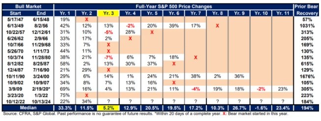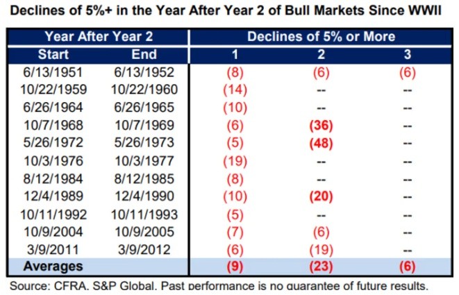 根據 CFRA Research 首席投資策略師 Sam Stovall 的分析,自 1947 年以來,所有經歷了兩週年紀念的 11 次牛市在接下來的 12 個月裏都至少經歷了一次 5% 或以上的下跌,有些甚至進入了新的熊市。