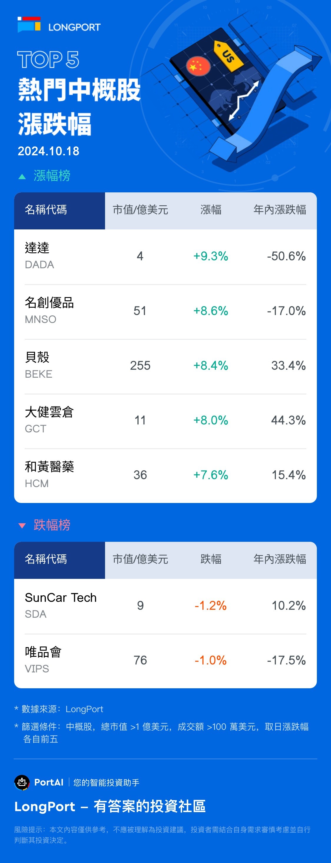 達達 (DADA) 涨 9.33%,成交额 313.5 万美元,年内累计跌 50.6%。 名創優品 (MNSO) 涨 8.58%,成交额 3351.1 万美元,年内累计跌 17%。 SunCar Tech(SDA) 跌 1.2%,成交额 435.3 万美元,年内累计涨 10.2%。 唯品會 (VIPS) 跌 0.97%,成交额 4567.8 万美元,年内累计跌 17.5%。