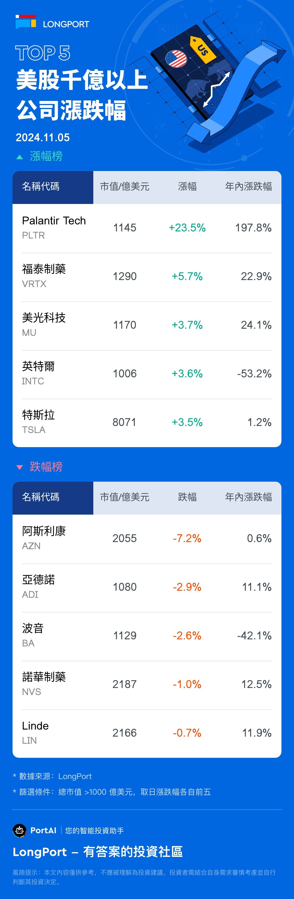 Palantir Tech(PLTR) 涨 23.47%,成交额 103.7 亿美元,年内累计涨 197.8%。 福泰制藥 (VRTX) 涨 5.73%,成交额 8.5 亿美元,年内累计涨 22.9%。 阿斯利康 (AZN) 跌 7.22%,成交额 10.1 亿美元,年内累计涨 0.6%。 亞德諾 (ADI) 跌 2.94%,成交额 8.2 亿美元,年内累计涨 11.1%。