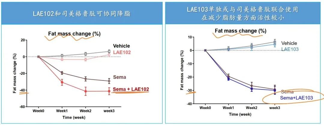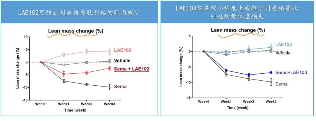 根據來凱醫藥公佈的 DIO 模型,LAE102 和 LAE103 都對瘦體重有增加效果,而 LAE102 更顯著,並且 LAE102 與司美格魯肽可協同減脂。