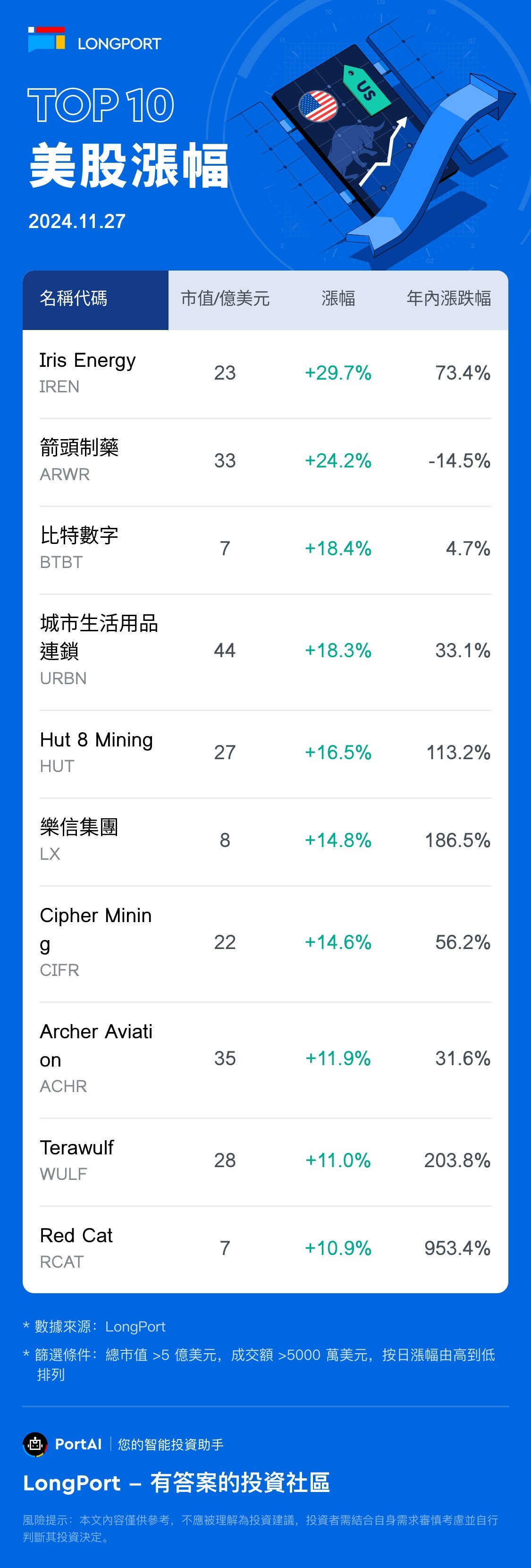 Top 10 US Stock Gainers (11.27)