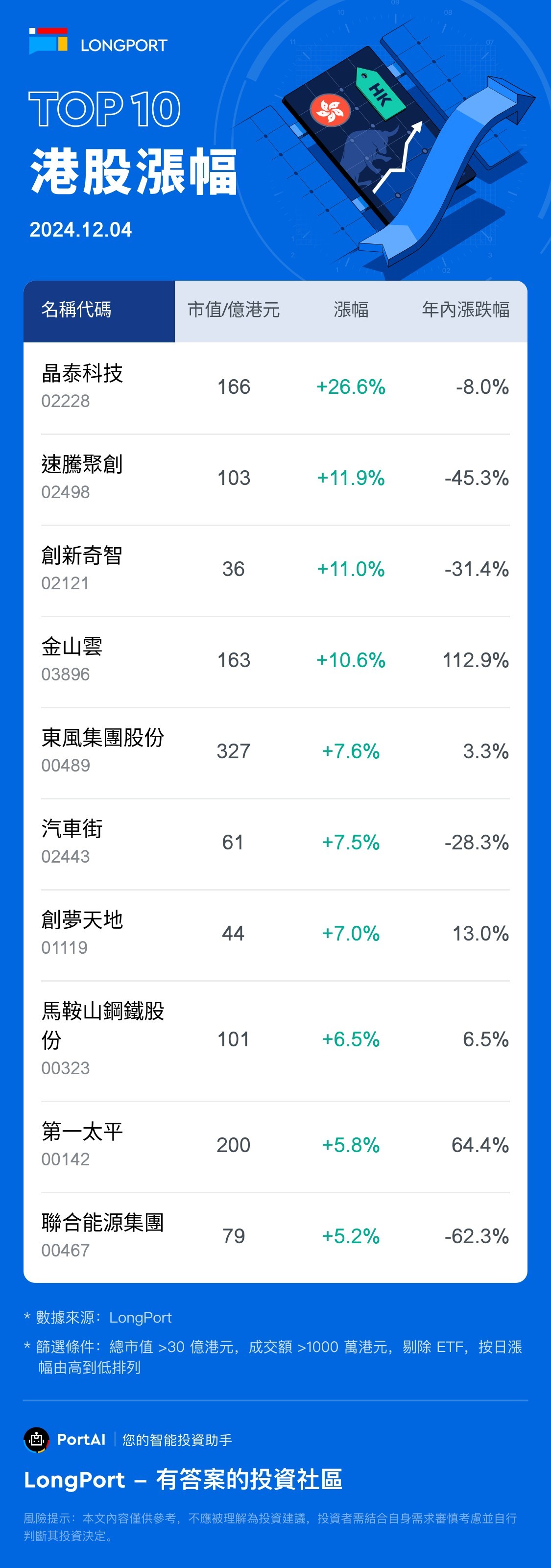 晶泰科技 (02228) 涨 26.56%,成交额 9.8 亿港元,年内累计跌 8%。