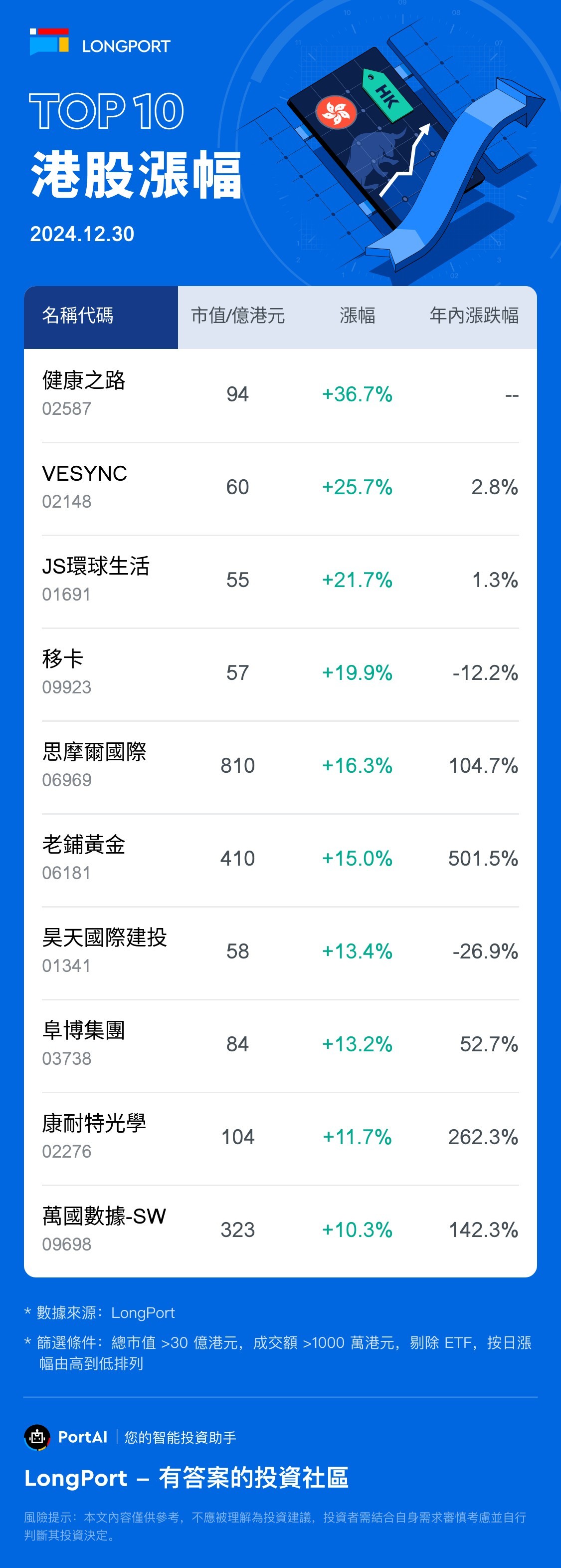 健康之路 (02587) 涨 36.67%,成交额 3258.6 万港元,年内累计。 VESYNC(02148) 涨 25.71%,成交额 5777.7 万港元,年内累计涨 2.8%。 JS 環球生活 (01691) 涨 21.71%,成交额 2.2 亿港元,年内累计涨 1.3%。