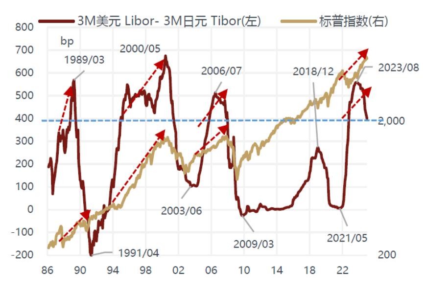日本央行對全球流動性的溢出效應主要通過息差交易來實現,而息差交易的基礎就是美日的短期利差要達到足夠大的程度,才能夠藉助日元融資向全球市場注入流動性。從歷史經驗數據來看,當美日短期利差保持在 400bp 以上時,美股就會呈現漲幅大、波動小的特徵,低於 400bp 時美股幾乎不再上漲,且波動率大幅上升。目前美日的短期利差已經縮窄至 400bp 附近,2024 年 8 月由於息差交易逆轉引發的全球股市暴跌很可能只是 2025 年的預演。