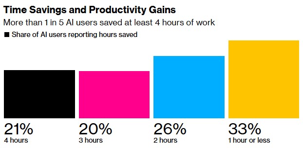 Among respondents who used generative artificial intelligence last week, 21% reported saving 4 hours or more, 20% reported saving 3 hours, 26% reported saving 2 hours, and 33% reported saving 1 hour or less.