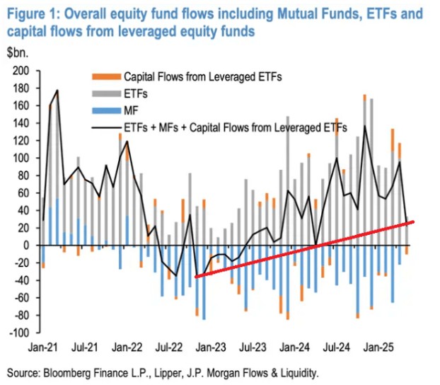 摩根大通最新资金流动数据显示,资金流入已回落至 2023 年 1 月 AI 行情启动时的水平,趋势逆转信号显著。