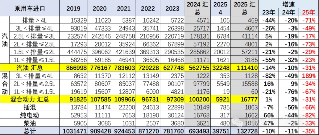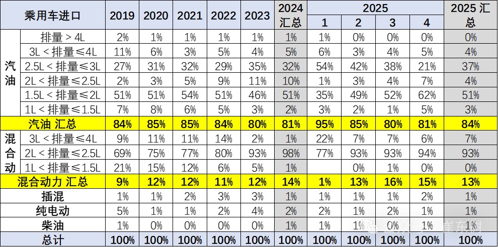 The displacement of imported passenger vehicle models was originally concentrated in gasoline models below 2 liters, with the proportion of imports in the 1-4 months of 2025 accounting for 54% of the total gasoline vehicle imports, an increase of 1 percentage point compared to last year.