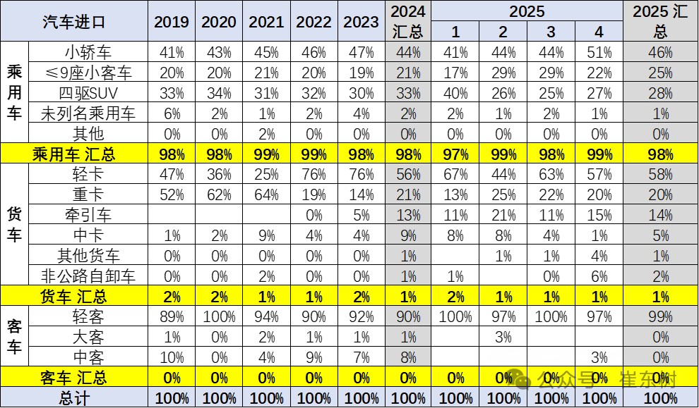 Among passenger cars, from January to April 2025, imported sedans accounted for 46%; imported four-wheel drive SUVs accounted for 28%; while the import share of unnamed electric vehicles was 1%. The performance of commercial vehicle imports in 2025 has been average, especially with a significant decline in light truck imports, while imports of tractors and medium trucks are also weak. Recent imports of pickups have also been very weak.