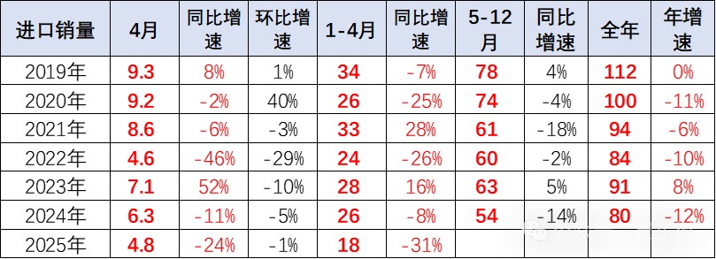 From January to April 2025, 135,000 imported cars were recorded, a year-on-year decrease of 35%, marking a significant decline for this period. In April alone, 40,000 imported vehicles were sold, down 22%. In 2024, car imports totaled 700,000 units, a year-on-year decrease of 12%. With the rise of domestic vehicles and the acceleration of international brand localization, car imports have remained sluggish in recent years, experiencing three consecutive years of negative growth; if fluctuations are smoothed out, this represents seven years of continuous negative growth.