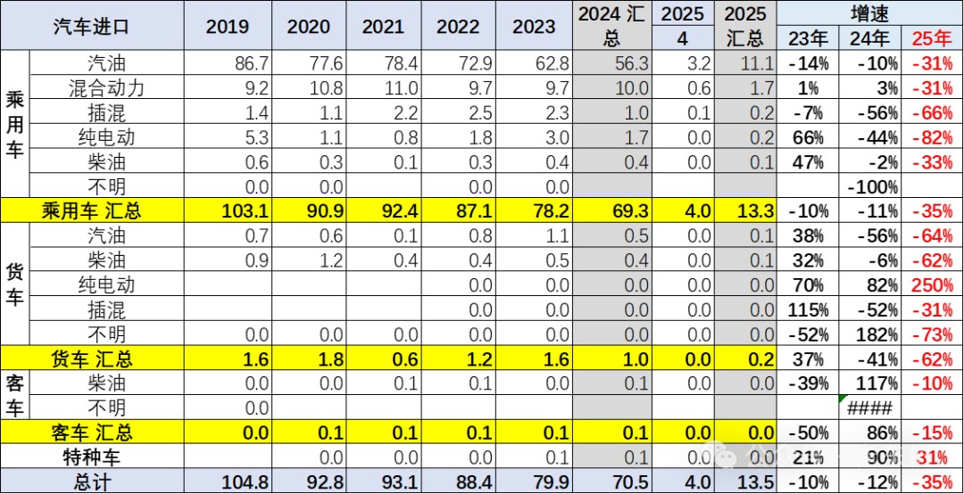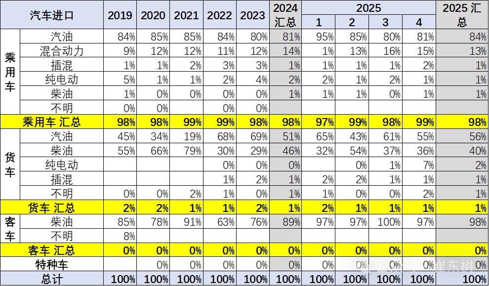 In 2024, the proportion of imported new energy passenger vehicles reached 3%, and from January to April 2025, the proportion of imported new energy vehicles decreased to 2%. The pure electric segment saw a slight decline compared to last year, while fuel passenger vehicles remain the absolute mainstay. The proportion of gasoline vehicles among trucks is still relatively high, but diesel vehicles have improved well.