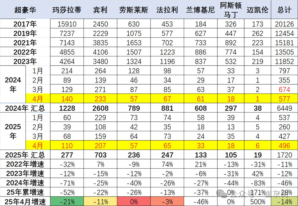 In recent years, the imported super luxury car segment has continued to grow, but there has been a significant decline since 2023, accelerating in 2024, with a strong decline still observed from January to April 2025. Ferrari's performance is strong. Bentley and Rolls-Royce have shown relatively stable performance, although they have been declining consecutively, they still maintain relatively high sales. Maserati's performance has been generally sluggish, and the overall super luxury segment is weakening, reflecting a temporary slowdown in the purchasing power of the ultra-high-end consumer group, but high-end Ferrari models performed well from January to April 2025.