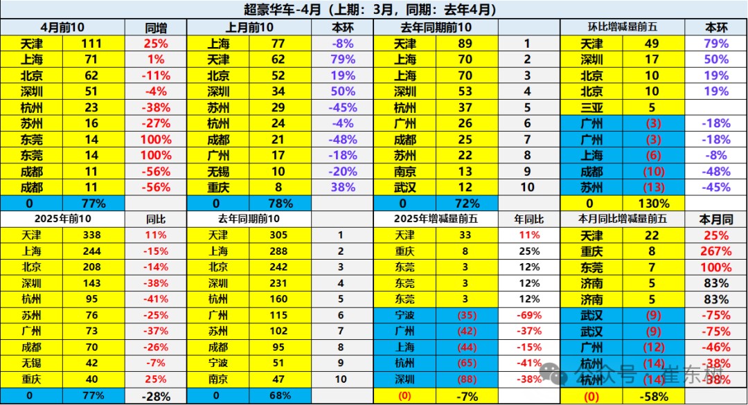 The overall demand in the imported car market is relatively weak, with Tianjin surpassing Shanghai to become the leader in super luxury cars. The imported super luxury car market in traditional affluent areas such as Shanghai, Shenzhen, Beijing, and Chengdu is under significant pressure. The impact of new energy vehicles on super luxury cars is minimal, as wealthy consumers seek to showcase their status, and brands like Ferrari continue to perform well. Due to the high-end business and identity characteristics of super luxury cars, the overall market demand is poor.