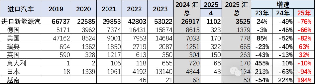 In 2024, domestic vehicles became more competitive, and imports from major countries for new energy vehicles declined by half. The pressure on imported new energy passenger vehicles in 2025 further increased, with some sales remaining for European imports of new energy.