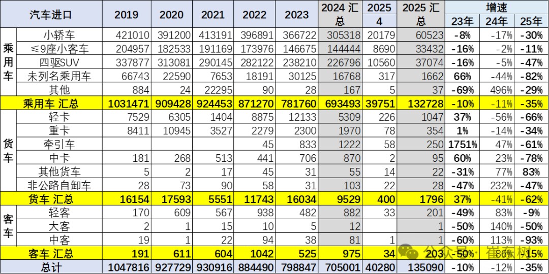 The imported vehicle market from 2017 to 2019 was relatively stable. Since 2022, all types of vehicles have seen a comprehensive decline. Traditional trucks saw a significant increase in imports in 2023, but there has been a noticeable rapid decline since then. From January to April 2025, the import of passenger cars was less than demand, and import volumes are expected to recover.
