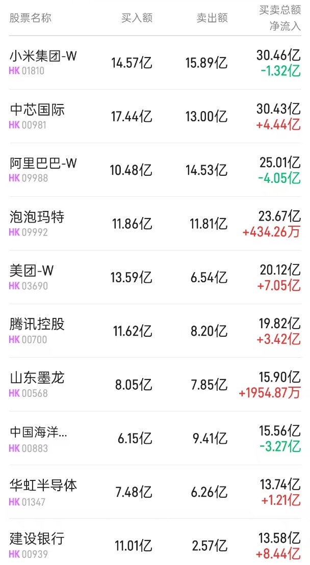 北水淨買入最多的個股是美團-W(03690)、建設銀行 (00939)、中芯國際 (00981)。北水淨賣出最多的個股是阿里巴巴-W(09988)、中海油 (00883)、小米集團-W(01810)。