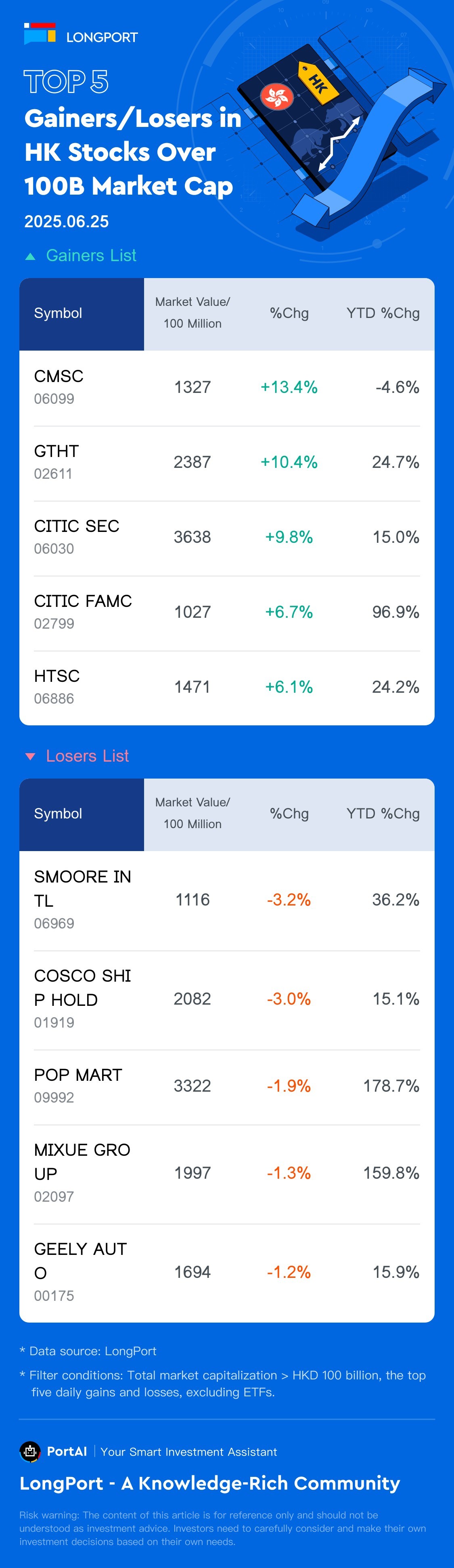 Top 5 HK Stock Gainers/Losers (>100B) (6.25)