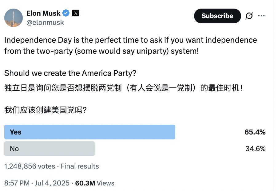 在法案簽署前數小時,馬斯克發起網絡投票徵詢是否應成立 “美國黨”,約 124.9 萬網民參與投票,65.4% 表示支持。基於這一結果,馬斯克於 7 月 5 日正式宣佈新黨成立。