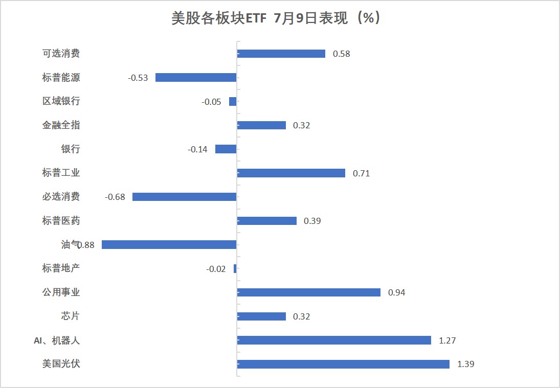 美股光伏板塊反彈 1.39%,AI 機器人 ETF 上漲 1.27%,公用事業 ETF 上漲 0.94%。油氣板塊下跌 0.88%、美股行業板塊中表現最差。