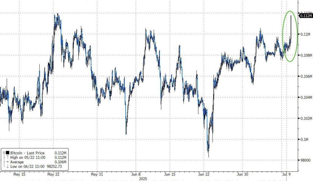美元持穩,日元和瑞郎表現出色。離岸人民幣持穩,隱含波動率指標跌至近一年來的最低水平。巴西雷亞爾暴跌,特朗普表示將對南美洲國家進口商品徵收 50% 關税。比特幣紐約尾盤時段飆升至 11.2 萬美元,突破歷史新高,今年已累計上漲近 19%。