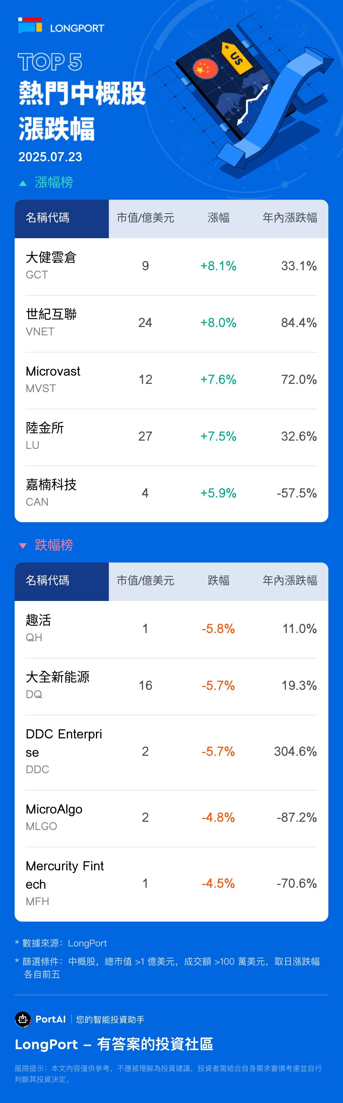 大健雲倉 (GCT) 涨 8.11%,成交额 3645.1 万美元,年内累计涨 33.1%。 世紀互聯 (VNET) 涨 8.03%,成交额 5329.8 万美元,年内累计涨 84.4%。 趣活 (QH) 跌 5.81%,成交额 352.5 万美元,年内累计涨 11%。 大全新能源 (DQ) 跌 5.73%,成交额 5456.9 万美元,年内累计涨 19.3%。