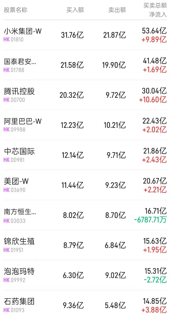此外,國泰君安國際 (01788) 獲淨買入 4.3 億港元,而南方恒生科技 (03033) 遭淨賣出 6787 萬港元。
