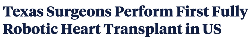 According to the American College of Surgeons, Texas doctors used a robotic platform to remove and implant a donor heart through small, precise incisions, avoiding the need for an invasive open procedure that would break the sternum.