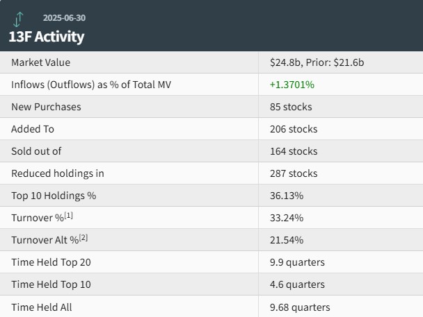 橋水基金在 2025 年第二季度的持倉報告中顯示,總市值達 248 億美元,環比增長 15%。新增 85 只個股,增持 206 只,減持 287 只,清倉 164 只。前十大持倉佔總市值的 36.13%。英偉達 (NVDA.US) 持倉大增 154.37%,成為第三大重倉股。SPDR 標普 500 指數 ETF 和 iShares 標普 500 指數 ETF 分別位列前兩位。